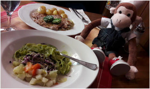 Kalbsschnitzel mit Rosmarinkartoffeln und Nudeln mit pikantem Pesto.